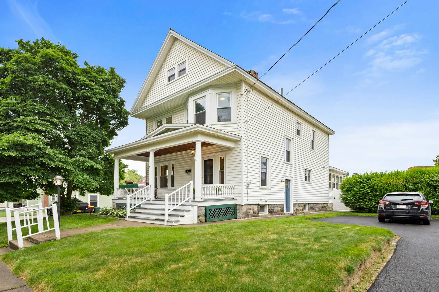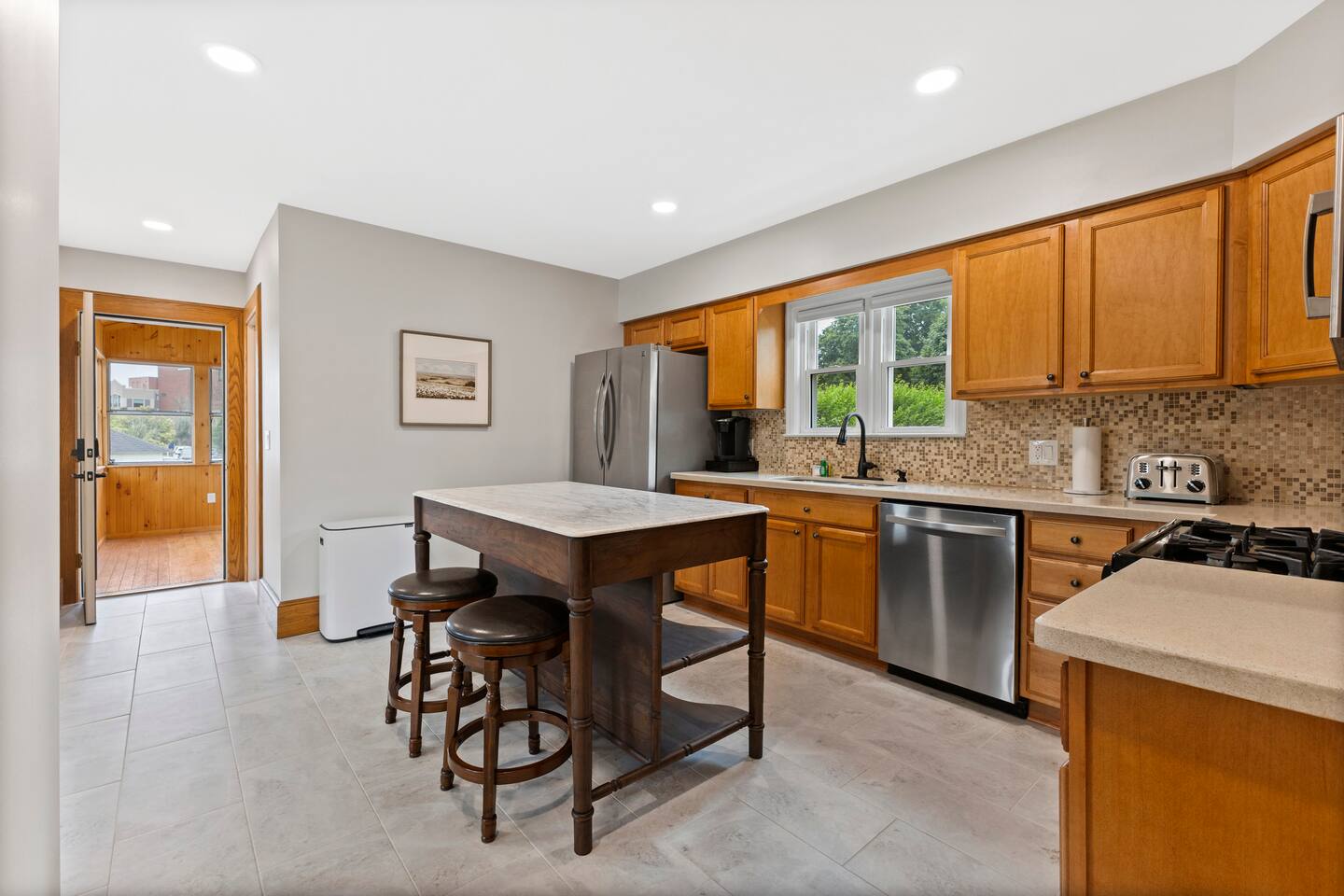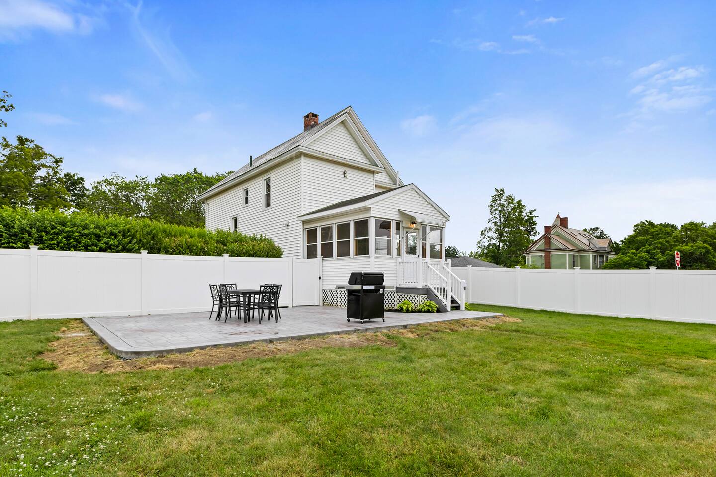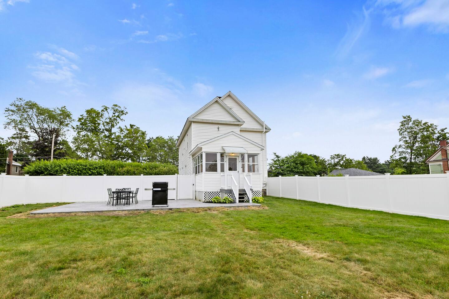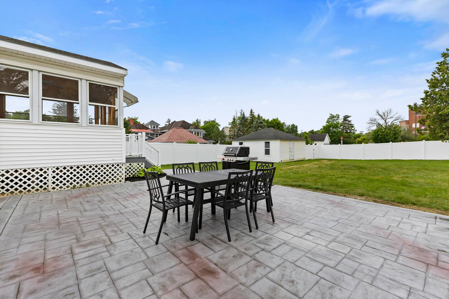 The first floor boasts an open kitchen to living concept with a fully equipped kitchen with floating island and a living room with comfortable seating for 7. A beautiful new remodeled bathroom with walk-in shower is just around the corner. The ornate foyer opens up to a large dining room for 8. A back door opens to the furnished sunroom and fully fenced backyard that has a large patio, outdoor seating, BBQ grill, and dining table and chairs for 8. Walk up the charming original staircase to the second floor, which contains 4 bedrooms and a full bathroom with shower/tub combo. Washer/Dryer combo unit is on the second floor. The home has 1 gigabit WiFi throughout, and YouTubeTV is provided on all TVs.