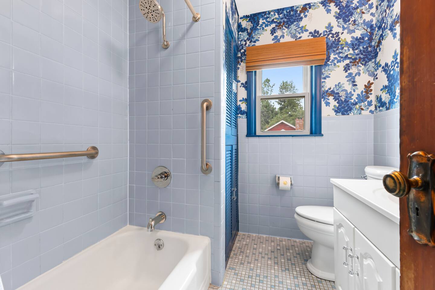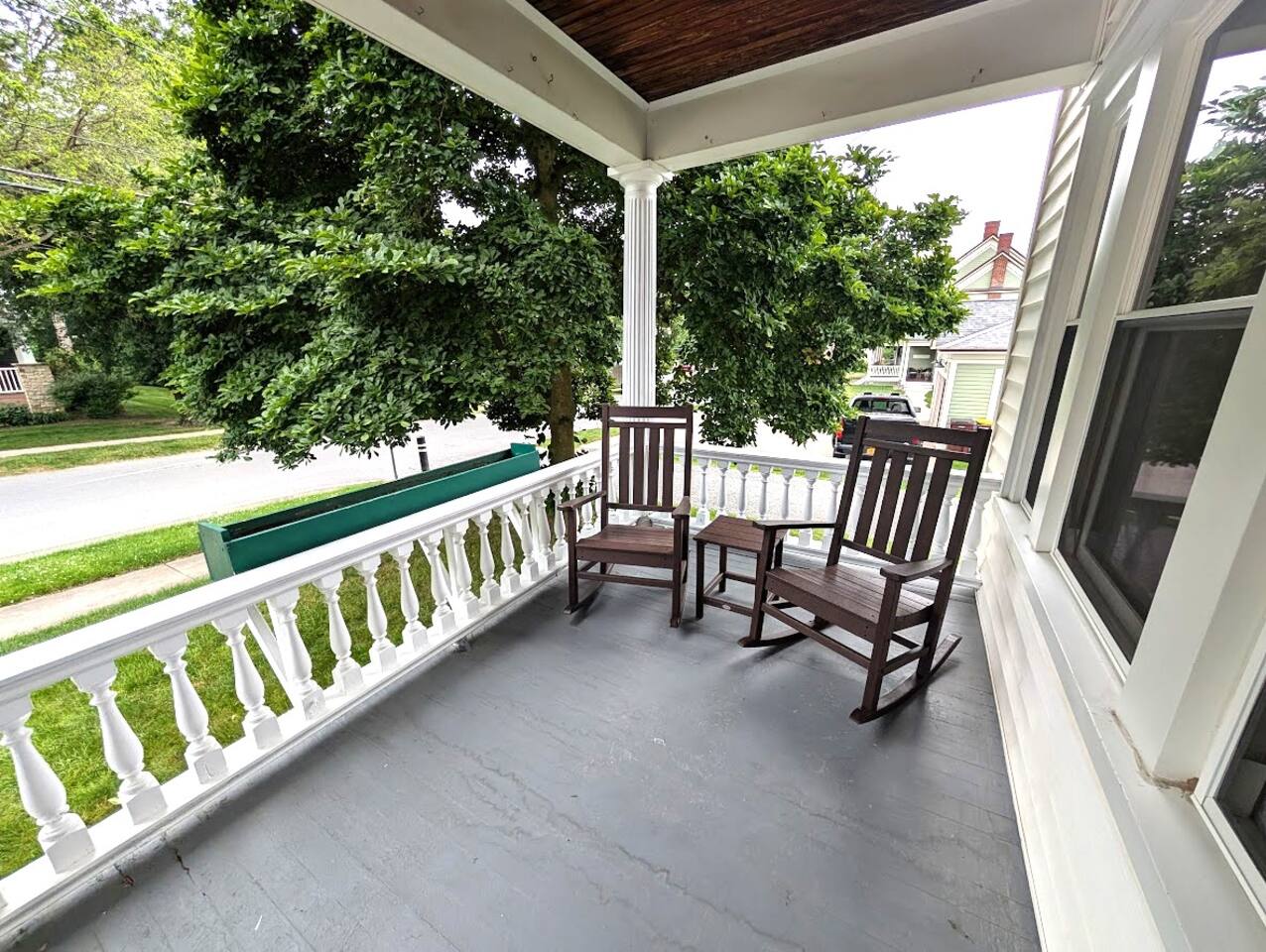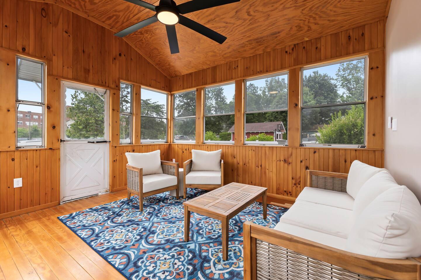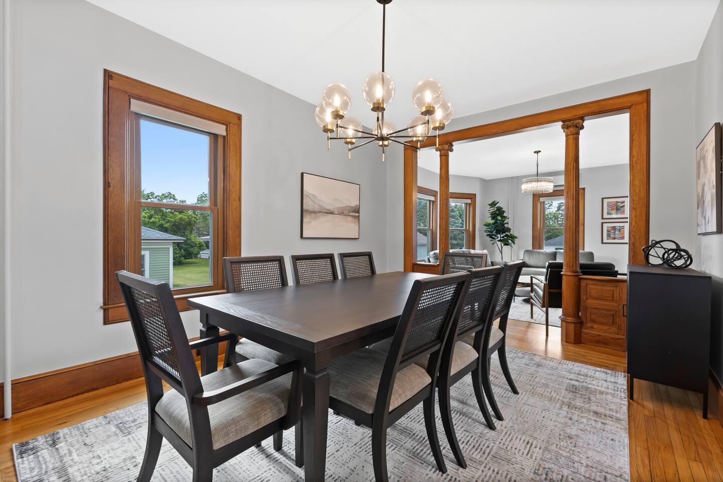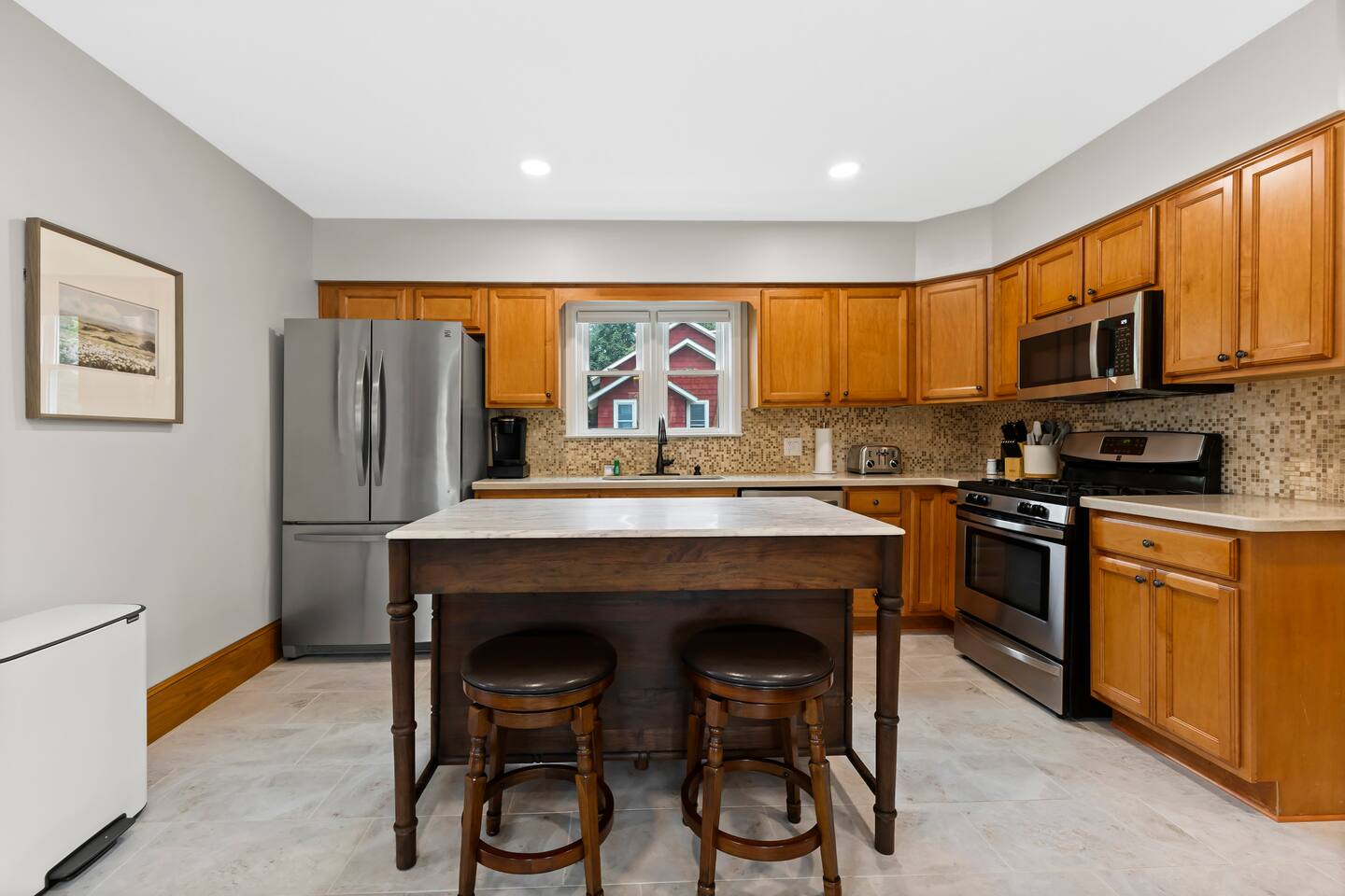 The first floor boasts an open kitchen to living concept with a fully equipped kitchen with floating island and a living room with comfortable seating for 7. A beautiful new remodeled bathroom with walk-in shower is just around the corner. The ornate foyer opens up to a large dining room for 8. A back door opens to the furnished sunroom and fully fenced backyard that has a large patio, outdoor seating, BBQ grill, and dining table and chairs for 8. Walk up the charming original staircase to the second floor, which contains 4 bedrooms and a full bathroom with shower/tub combo. Washer/Dryer combo unit is on the second floor. The home has 1 gigabit WiFi throughout, and YouTubeTV is provided on all TVs.